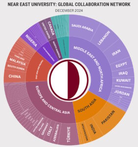 The chart above highlights Near East University's global research collaboration network for December 2024, based on publications indexed in the Scopus database. Demonstrating a consistent commitment to international academic engagement, the university maintained a robust network of partnerships across diverse regions, reflecting its dedication to advancing knowledge through collaborative efforts.