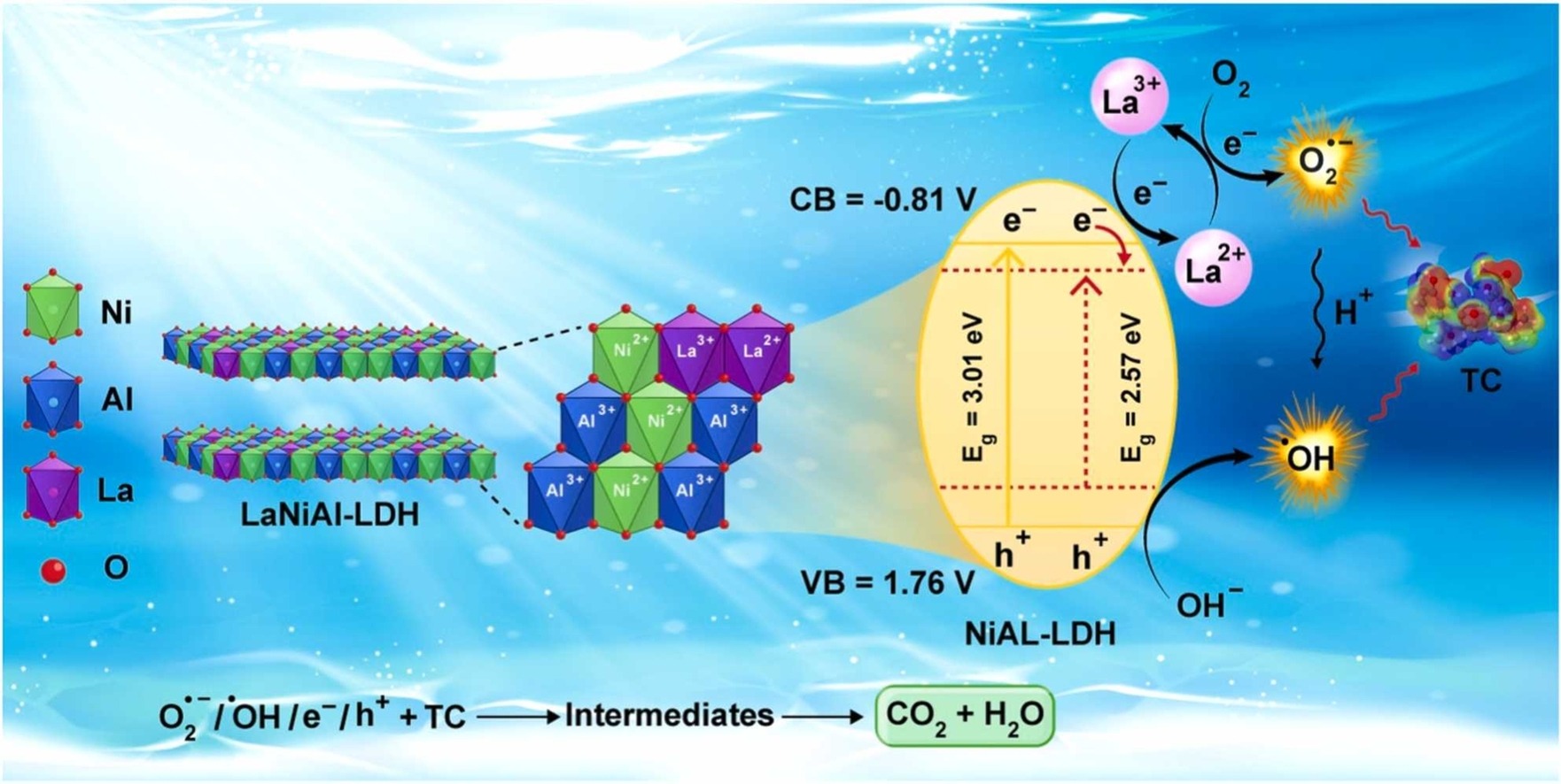 In addition to demonstrating high photocatalytic efficiency, the LaNiAl-LDH photocatalyst exhibited good reusability, maintaining 72% degradation efficiency after six cycles, with negligible metal leaching and structural stability. The proposed degradation pathway highlighted the breakdown of TC through the dissociation of functional groups and benzene ring opening. Moreover, the catalyst showed resistance to interference from various anions and effectively degraded pollutants in real wastewater.