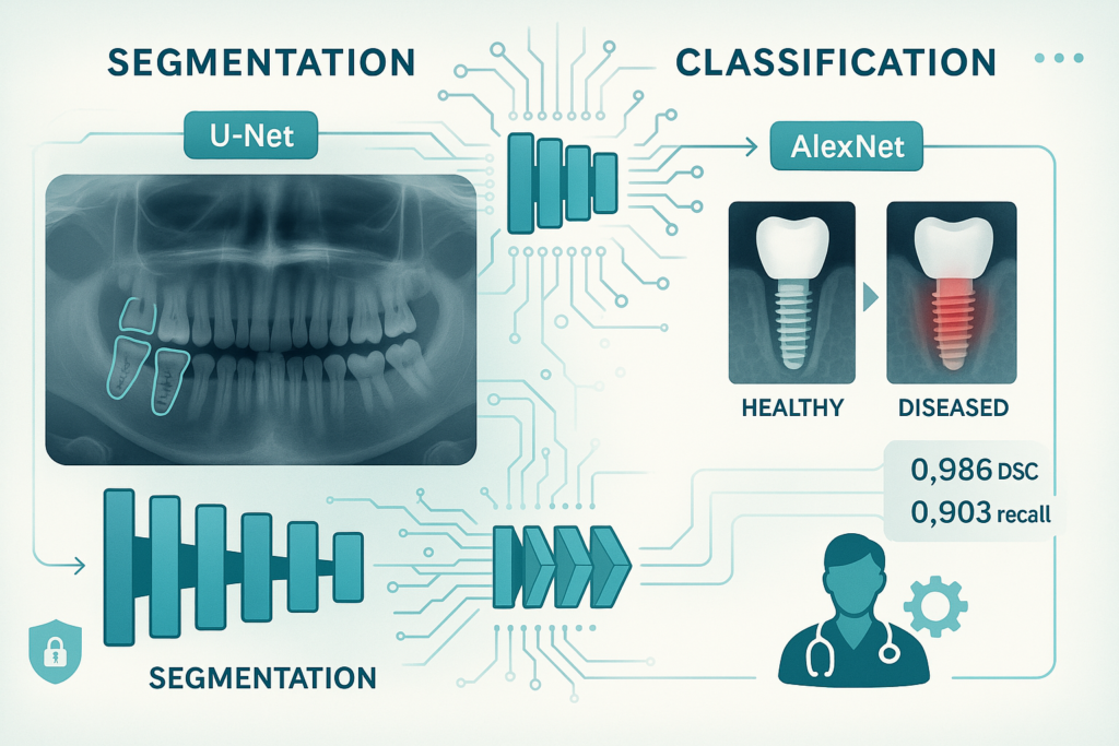 The study utilized a dataset of 7,696 OPG images obtained from a university clinic and a private practice. Following exclusion criteria, manual segmentation of implants was performed by specialists using annotation tools, and a U-Net architecture was employed to segment implant regions. For classification, the AlexNet model was trained to distinguish between healthy and diseased implants based on image features.