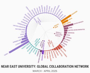 The chart above highlights Near East University’s global research collaboration network for March–April 2025, based on publications indexed in the Scopus database. Reflecting the university’s sustained commitment to international academic cooperation, the chart reveals a broad and dynamic network of collaborations with institutions across diverse geographical regions.