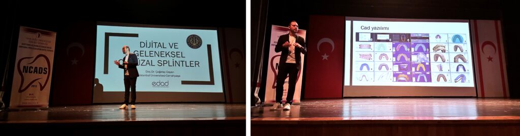 Assoc. Prof. Dr. Çağatay Dayan from İstanbul University – Cerrahpaşa delivered a comprehensive lecture on the clinical role and production workflows of occlusal splints, offering students a structured overview of both conventional and digital approaches. In his presentation, he outlined the primary indications for occlusal splints—including temporomandibular disorders, myofascial pain, parafunctional habits such as bruxism, and occlusal stabilization in restorative and prosthetic cases. Dr. Dayan also compared the fabrication stages of conventional splints, with the increasingly adopted digital workflows, which integrate intraoral scanning, virtual articulation, CAD-based splint design, and CAM milling or 3D printing. Highlighting the advantages of digital production—such as improved precision, reproducibility, and chairside adjustability—he also addressed limitations, including cost, operator proficiency, and software–hardware compatibility issues. By presenting clinical cases and step-by-step design principles, he demonstrated how digital splint therapy can enhance patient comfort, reduce adjustment time, and support interdisciplinary treatment planning.