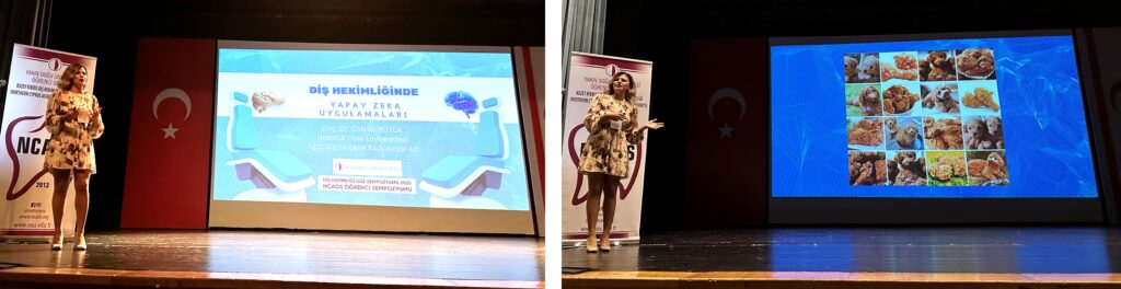 Assoc. Prof. Dr. Cansu Büyük from İstanbul Okan University delivered an extensive presentation on the expanding role of artificial intelligence (AI) in dentistry, highlighting its applications across diagnostics, clinical decision-making, and dental education. Focusing first on oral radiology, she demonstrated how AI-supported imaging systems enhance the detection of caries, periapical lesions, periodontal bone loss, impacted teeth, and anatomical variations through automated analysis and improved diagnostic accuracy. She also discussed AI algorithms designed to assist in cephalometric landmark identification, orthodontic treatment planning, and implant positioning, emphasizing their potential to reduce operator variability and streamline workflows. She highlighted how these technologies are reshaping clinical practice by offering data-informed insights, improving precision, and expanding the scope of minimally invasive dentistry. A significant part of her talk focused on AI in dental education, where interactive learning platforms, automated assessment tools, and virtual simulation technologies help students develop clinical reasoning, diagnostic accuracy, and psychomotor skills in a controlled, feedback-rich environment.